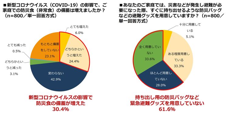 新型コロナウイルスの感染拡大は、外出制限や自宅で過ごす時間が増えたことで、食料などを継続的に自宅に備蓄する家庭も増えたようです。そこで新型コロナウイルスの影響で、家庭の防災食(非常食)の備蓄が増えたかどうかを聞いたところ、増えたと回答した方が30.4%に上るなど、家庭の備えにも影響が出ていることが分かりました。