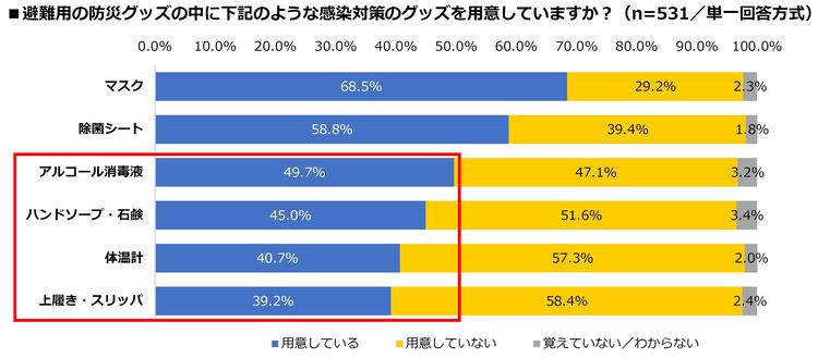 災害時に避難所での新型コロナウイルスの感染が危惧されることから、各自治体は避難用グッズとして各種感染拡大防止グッズを備えるようアナウンスしています。そこで、避難時用の防災グッズを少しでも用意していると回答した531人に、マスクやアルコール消毒液などの感染予防グッズを実際に用意できているかを聞いたところ、マスクでは68.5%が、除菌シートは58.8%が用意していると回答したのに対し、アルコール消毒液では49.7%、ハンドソープ・石鹸では45.0%、体温計では40.7%、上履き・スリッパでは39.2%と、それぞれ半数以上が用意できていない実態が明らかになりました。