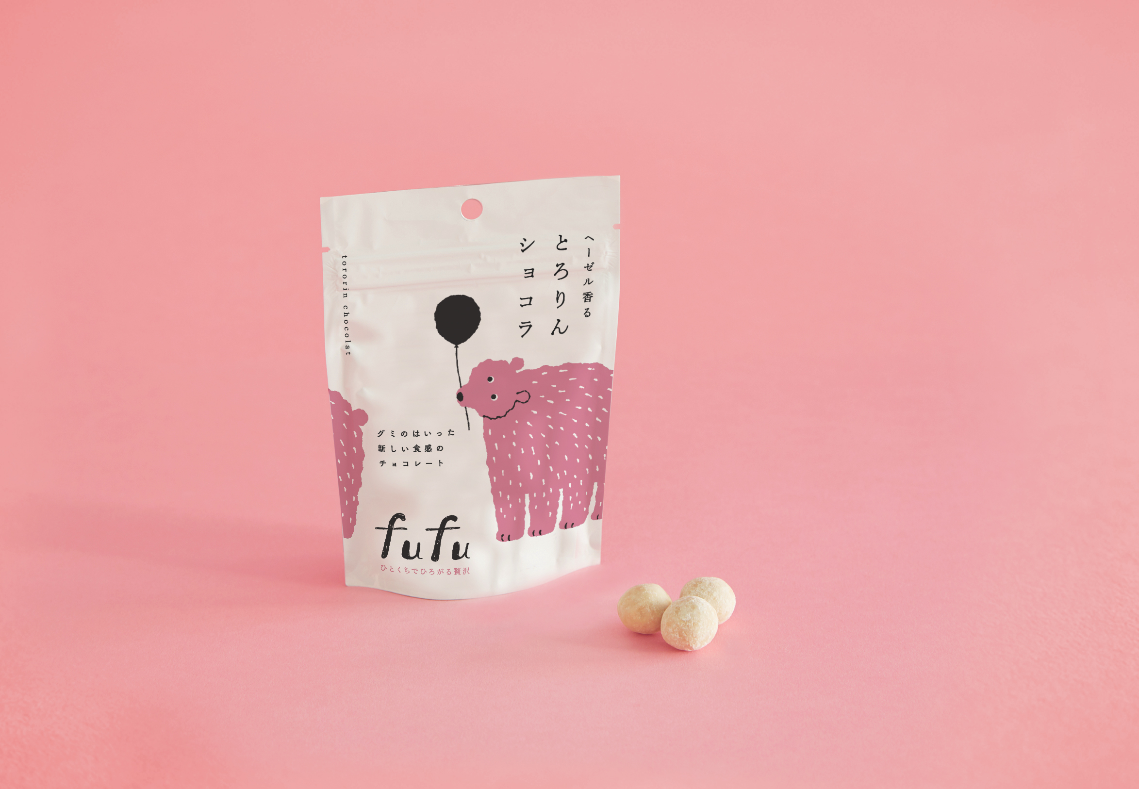 「fufu」の記念すべき第1号商品となる「ヘーゼル香るとろりんショコラ」。ヘーゼルナッツの香りと、とろけるような口どけがおいしいチョコレート。真ん中に入った‟もちグミ”の、もちっと面白い食感がアクセントとなり、とても楽しい食感をお楽しみいただけます。