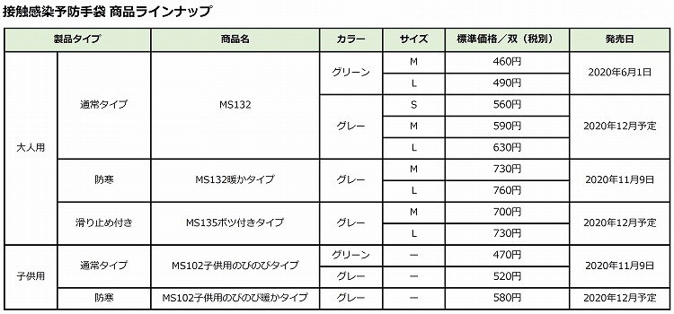 当社では2020年6月、抗菌・消臭・抗ウイルス作用を持つ機能繊維「DEW®」を国内では初となる手袋に応用し、接触感染予防手袋「MS132」を発売しました。その後、これからの季節に役立つ防寒タイプとご要望の多かった子供用のサイズの2タイプを新たに販売いたします。お子様の通学時や外出時はもちろんのこと、各種作業時など接触が気になる様々なシーンでご活用いただけます。洗って繰り返し使えるため経済的です。