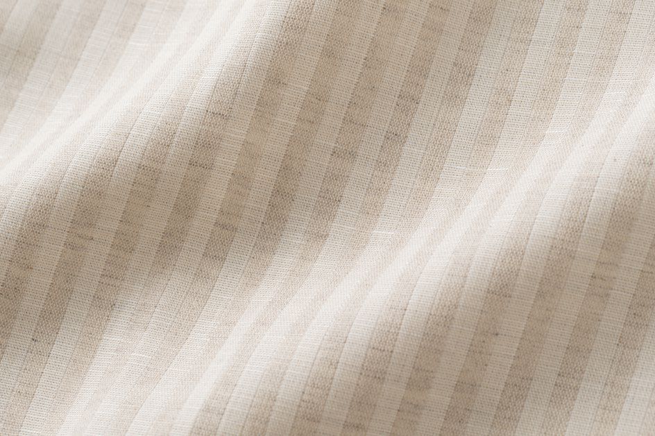 オーガニックコットンのナチュラル色とリネンのグレー色を使い、二重織仕立てでストライプに織り上げました。二重織ガーゼのようにざっくり織っているので、空気を含み通気性がよく、リネン使いで光沢が生まれ、スッキリとした表情になります。リネンのグレー色を通した太陽のひかりは、落ち着いた雰囲気の空間を演出できるでしょう。