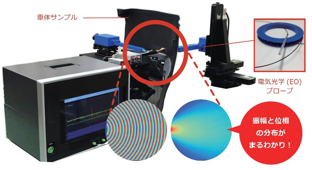 ■電界を検出するプローブは光ファイバケーブルや電気光学結晶3)などの誘電体部品で構成されており、従来技術のような金属アンテナや金属ケーブルを用いていないため、電界分布を乱さず非侵襲で計測可能。
