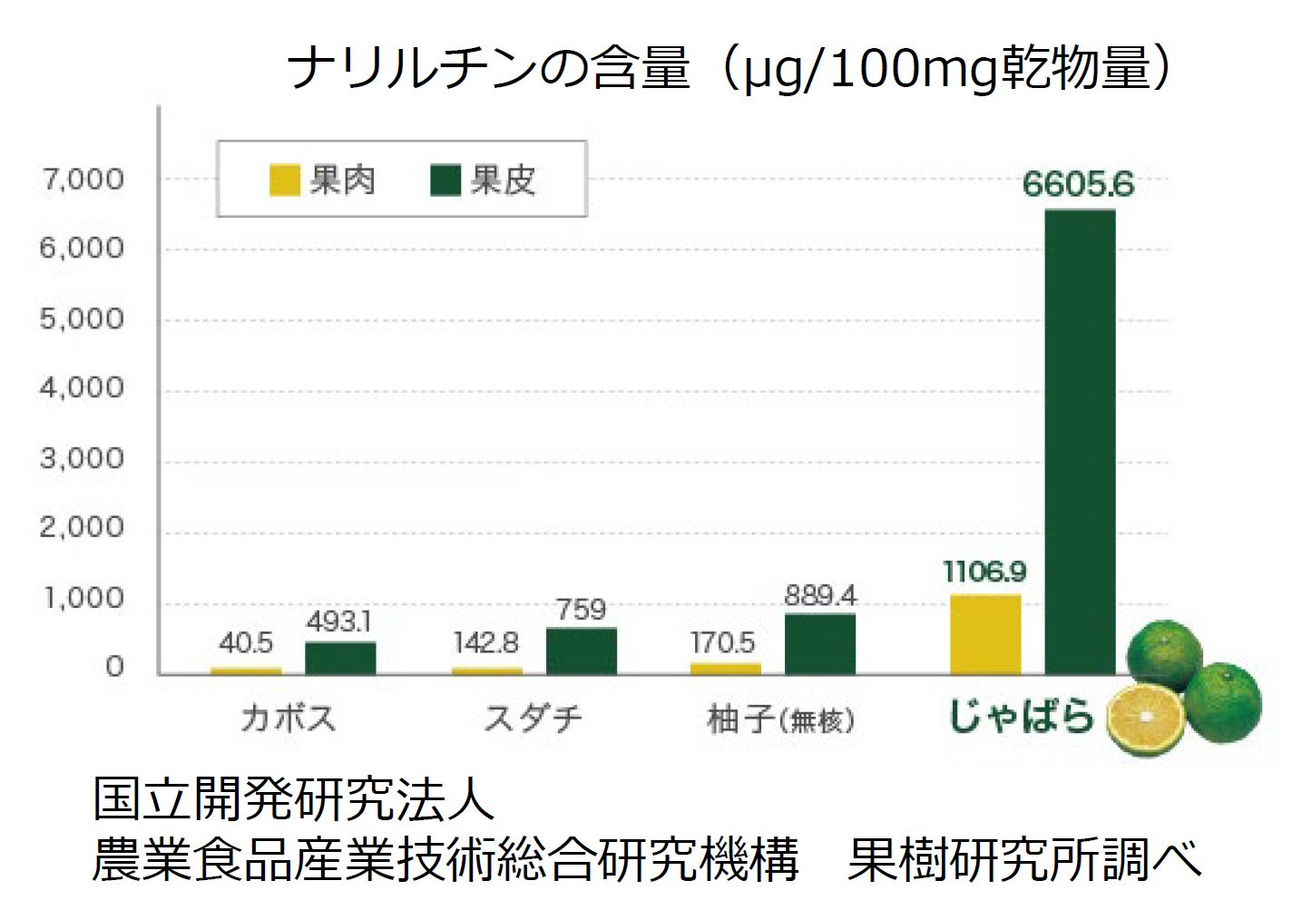 一般的に柑橘類の皮は苦く捨ててしまいがちで、じゃばらにも同様なことが言えます。しかし、じゃばらの果皮には、果肉に比べて6倍ものナリルチンが含まれているので、当社ではいかに美味しく・食べやすく・安全な果皮商品を作ることができるかを長年の課題として試作を重ねてきました。造粒タイプの「じゃばらっ粉」は、じゃばらの果皮の豊富なナリルチンを手軽に摂ることができます。