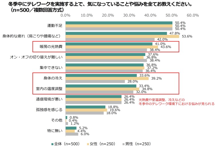 1位「運動不足(50.4%)」2位「身体的な疲れ(肩こりや腰痛など)(47.8%)」3位「暖房による光熱費(41.0%)」