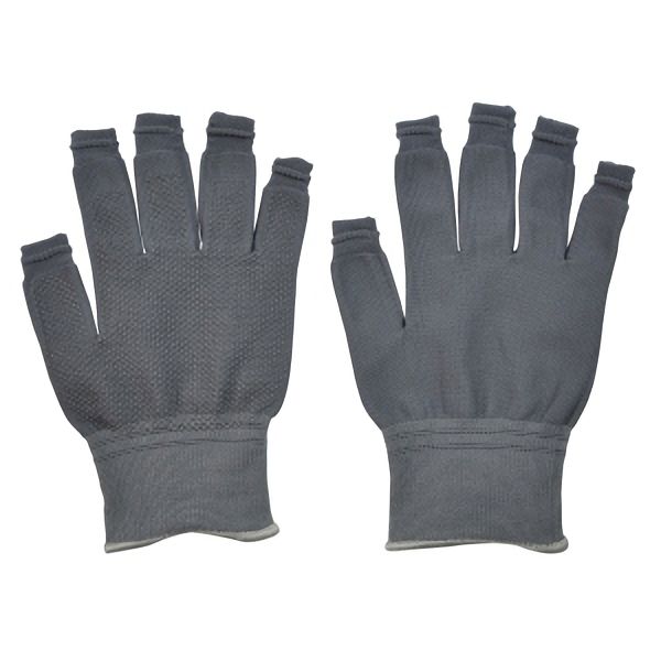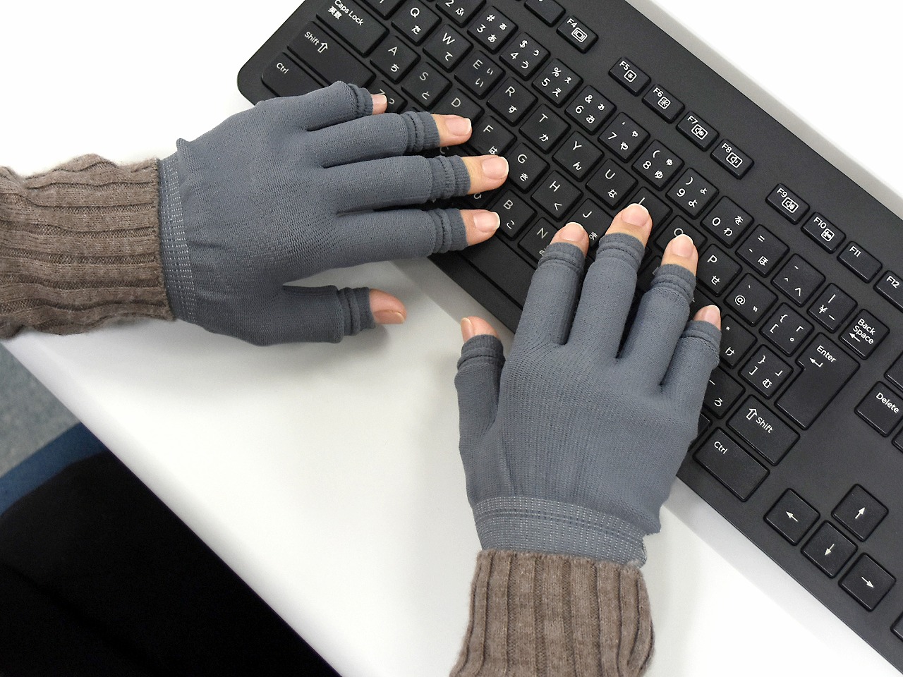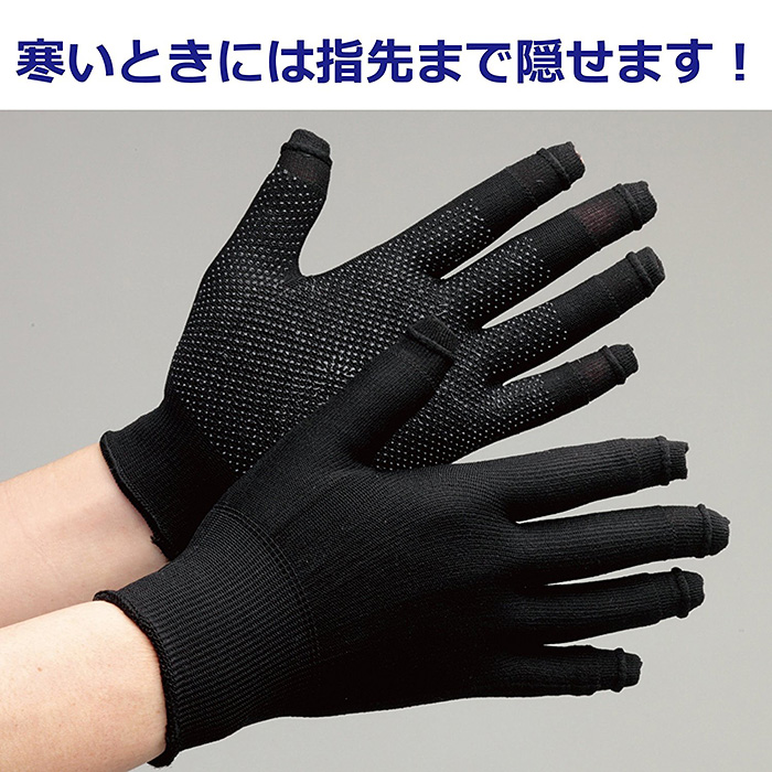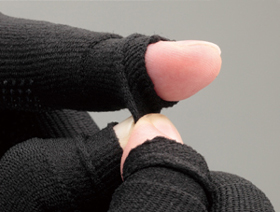 「スライドタッチ」は手袋から指先だけ出すことが可能で、キーボード入力を妨げず着用することが可能です。指先部分はパイプ編み加工がしてあり、5本の指先出し入れ(着脱)を自由に調整することができます。