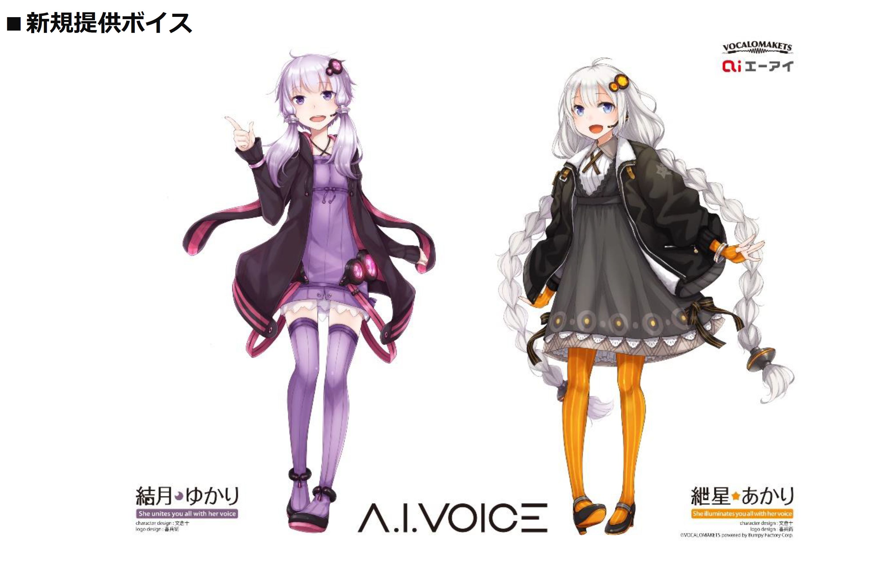 高品質音声合成エンジンAITalk(R)を開発・提供する株式会社エーアイ(本社:東京都文京区、代表取締役社長:吉田大介、証券コード:4388、以下:エーアイ)は、個人向けエーアイオリジナルブランド「A.I.VOICE(TM)(エーアイボイス)」において、VOCALOMAKETS(ボカロマケッツ)の参入により、「結月ゆかり(ユヅキユカリ)」「紲星あかり(キズナアカリ)」のボイスを2021年内に販売開始(予定)することお知らせいたします。製品詳細、価格等の詳細につきましては、内容決定次第順次公開いたします。引き続き「A.I.VOICE(TM)」では、新規参入キャラクターの募集をおこなっております。