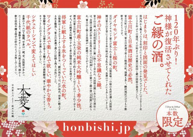 120年前の日本酒を復活させ富士川町に新しい地域資産をつくりあげることを目的にスタートした「まちいくふじかわ」プロジェクト。同プロジェクトに賛同し、偶然集まったいろんな人たちの力を合わせて120年ぶりの復活、2017年4月の商品化以降、限定数ではございますが、毎年、その年の「本菱」をお届けしております。