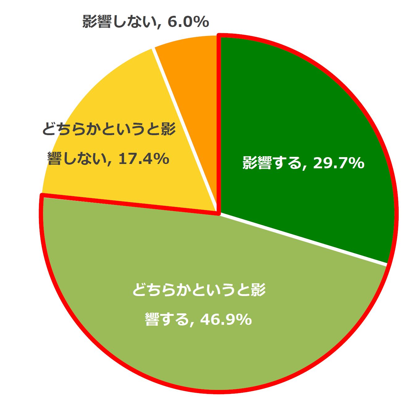 花粉症によるくしゃみや鼻水が、新型コロナウィルスの拡大に影響すると思うか質問をしたところ、76.6%が「影響する」(影響する:29.7%、どちらかというと影響する:46.9%)と回答しました。
