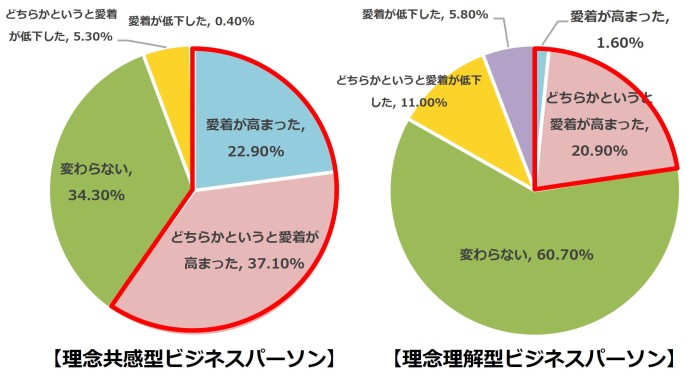 自身が働く会社の企業理念に共感しているビジネスパーソンと、理解だけのビジネスパーソンとでは、テレワーク中の会社に対する愛着の変化に、2倍以上の差があることが分かりました。