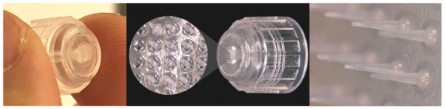 写真左・中央:中空型マイクロニードル写真右:中空型マイクロニードル先端、貫通孔部分の拡大写真