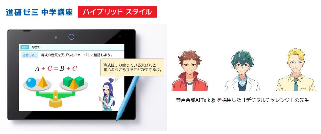 株式会社エーアイ(本社:東京都文京区、代表取締役:吉田大介、証券コード:4388、以下エーアイ)は、株式会社ベネッセホールディングスの子会社、株式会社ベネッセコーポレーション(本社:岡山県岡山市、以下:ベネッセ)の中学生向け通信教育「進研ゼミ中学講座」が2021年4月より展開する、タブレット学習を中心とした「ハイブリッドスタイル」の中学1・2年生向けの学習教材『デジタルチャレンジ』へ高品質音声合成エンジンAITalk(R)が採用されたことを、本日2021年4月1日にお知らせいたします。