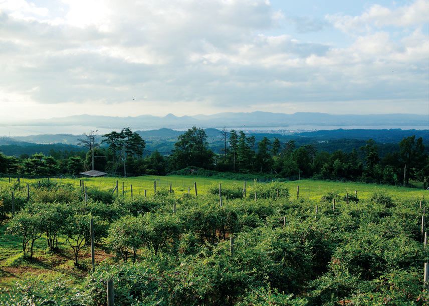 琵琶湖を一望できる大津市伊香立の小高い山の中腹。創業者・岩田康子さんがこの地でブルーベリーの栽培を始めたのは昭和58年。当時日本ではまだ珍しく指導者もない中、一冊の本を頼りに無農薬無化学肥料でブルーベリー栽培を始めました。