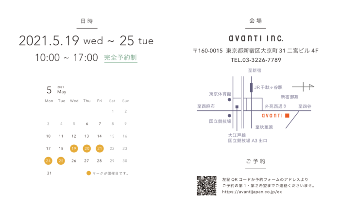 完全予約制の展示会となります。下記QRコードか予約フォームのアドレスより、