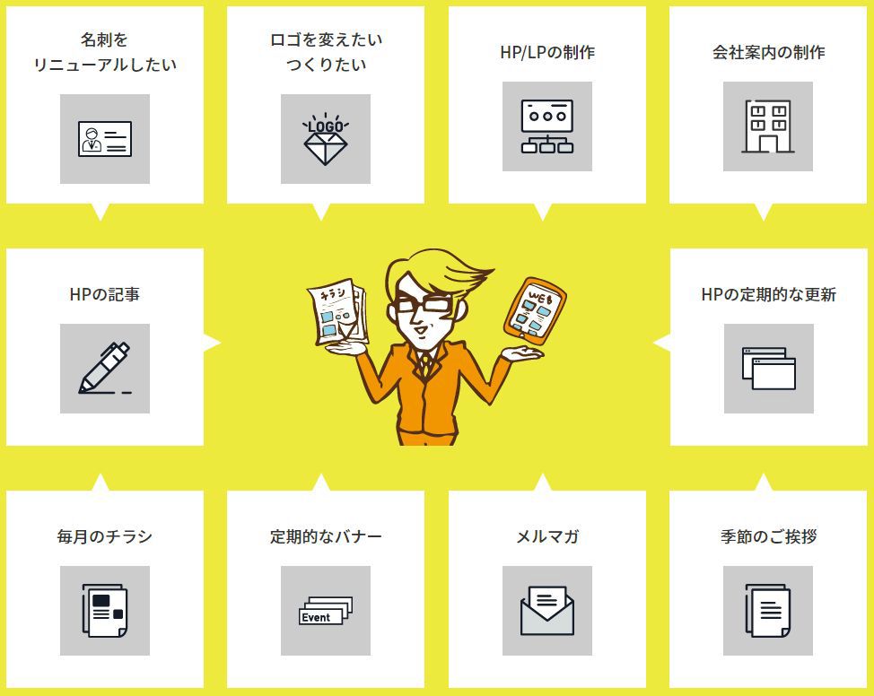 (名刺、ホームページ、ランディングページ、会社案内、チラシ、POP、ダイレクトメールの文面作成、HPの記事更新、HPのデザイン修正、デザインアドバイス/ディレクション。※その他ご相談可。)
