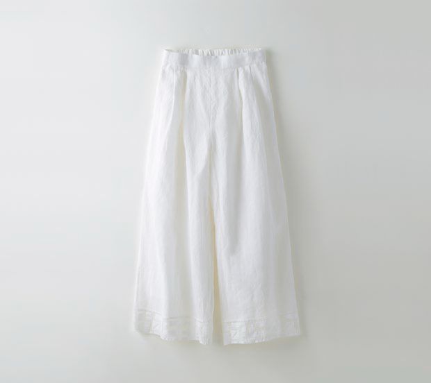 オリジナルのオーガニックコットンのトーションレースを裾に透かしてつけたハイウエストのパンツ。レースが涼しげで軽やかな印象です。オーガニックコットン100%の裏地つきで、汗ばむ夏にも気持ちが良く履いていただけます。後ろにはゴムを入れ着心地にもこだわりました。