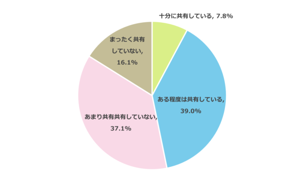 災害時の安否確認方法について、子どもと事前に話し合いや共有をしているか調査をしたところ、53.2%が「共有していない」(まったく共有していない:16.1%、あまり共有していない:37.1%)と回答しました。一方、「共有している」と答えた保護者は46.8%(十分に共有している:7.8%、ある程度は共有している:39.0)にとどまりました。家庭内での防災意識や準備の差が浮き彫りとなりました。