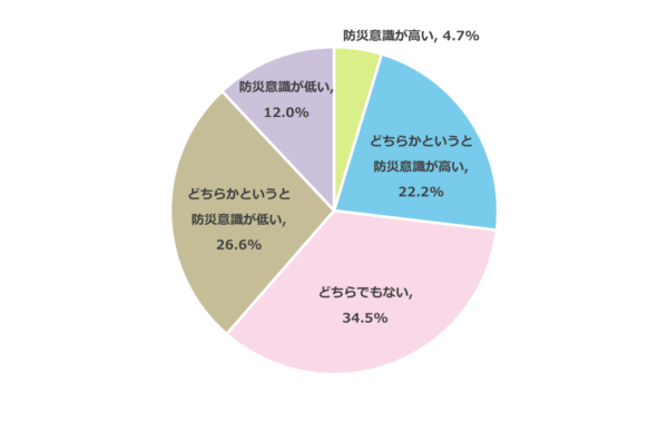 子どもの防災意識についてどのように感じるか調査したところ、38.6%が「防災意識が低い」(防災意識が低い:12.0%、どちらかというと防災意識が低い:26.6%)と回答しました。一方、「防災意識が高い」と答えた保護者は26.9%(防災意識が高い:4.7%、どちらかというと防災意識が高い:22.2%)にとどまり、「どちらでもない」とする回答も34.5%ありました。子どもの防災意識に対して、家庭内での関心や理解を深める必要性がうかがえます。
