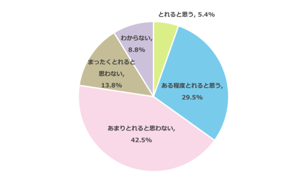 子どもは災害時に適切な避難行動をとれると思うか調査したところ、56.3%が「とれないと思う」(まったくとれると思わない:13.8%、あまりとれると思わない:42.5%)と回答しました。一方、「とれると思う」と答えた保護者は34.9%(とれると思う:5.4%、ある程度とれると思う:29.5%)にとどまりました。多くの家庭で子どもの避難行動に対して不安を感じている家庭が多いことが見て取れます。