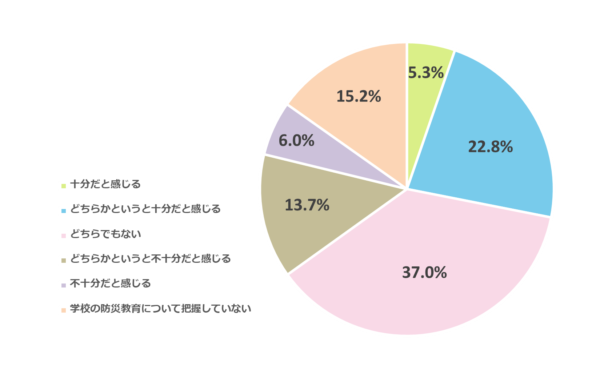 学校で実施している防災教育についてどのように感じているか調査したところ、28.1%が「十分だと感じる」(十分だと感じる:5.3%、どちらかというと十分だと感じる:22.8%)にとどまりました。一方、19.7%が「不十分だと感じる」(不十分だと感じる:6.0%、どちらかというと不十分だと感じる:13.7%)、37.0%が「どちらでもない」と回答、学校の取り組みに対する評価は分かれる結果となりました。