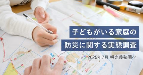 個別指導の学習塾「明光義塾」を全国展開する株式会社明光ネットワークジャパン(本社:東京都新宿区、代表取締役社長:岡本 光太郎)は、小学1年生~高校3年生の子どもを持つ全国の保護者1,100名を対象に、「子どもがいる家庭の防災に関する実態調査」を実施いたしました。