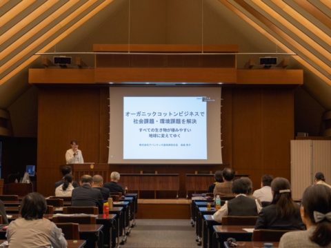 2025年12月14日(日)、立教大学 池袋キャンパス 太刀川記念館3階にて授賞式および受賞者による記念講演が行われました。代表取締役社長の奥森秀子が登壇し、「オーガニックコットンビジネスで社会課題・環境課題を解決 〜すべての生き物が棲みやすい地球に変えてゆく〜」をテーマに講演を行いました。講演では、当社が推進するコットン循環型事業や国産綿復活プロジェクトの取り組みについて紹介し、オーガニックコットンを基軸とした持続可能な未来へのビジョンを語りました。