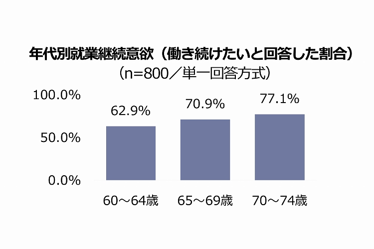 ■年齢が上がるほど就業意欲は上昇(60代前半62.9%→60代後半70.9%→70代前半77.1%)