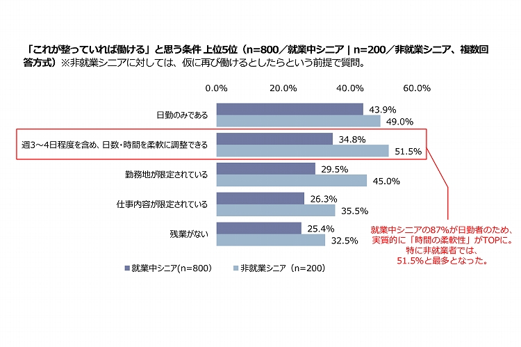 体力や生活状況に配慮した柔軟な勤務制度は、シニアの就業継続および新規就業の拡大に不可欠です。