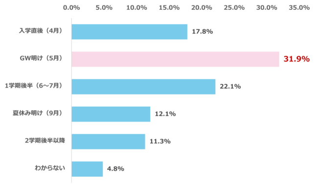 「中1の壁」を経験したと回答した保護者に対し、その影響が最も強く表れた時期について尋ねたところ、最も多かったのは「GW明け(5月)」で31.9%でした。次いで「1学期後半(6~7月)」22.1%、「入学直後(4月)」17.8%と続きました。