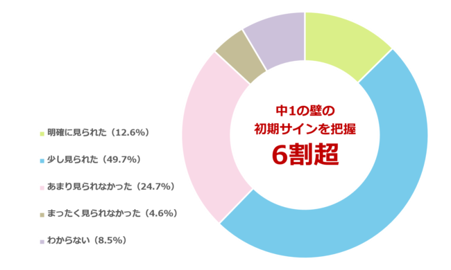 「中1の壁」を経験したと回答した保護者に対し、中学入学直後に初期サインがあったと思うかを尋ねたところ、62.3%が「見られた」(明確に見られた:12.6%、少し見られた:49.7%)と回答しました。