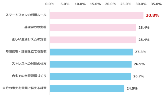 「中1の壁」を経験したと回答した保護者に、振り返って小学生のうちに準備しておけばよかったと感じることを尋ねたところ、最多回答は「スマートフォンの利用ルール(30.8%)」、次いで「基礎学力の定着(28.4%)」、「正しい生活リズムの定着(28.4%)」と続きました。