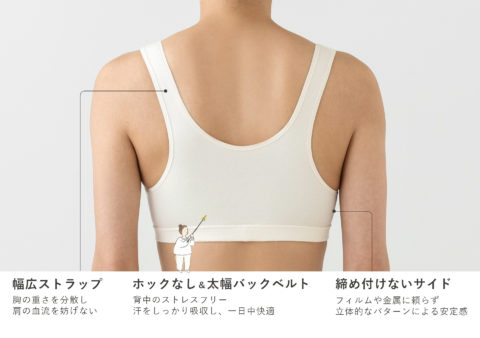 金具がないため、お休みの日、ナイトブラや旅行などの長時間移動、マッサージの際にも最適。
