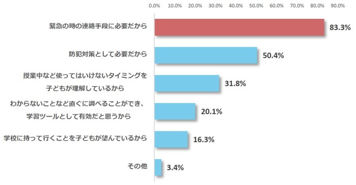 スマホ持込み賛成派の理由、最多は「緊急の時の連絡手段に必要だから(83.3%)」
