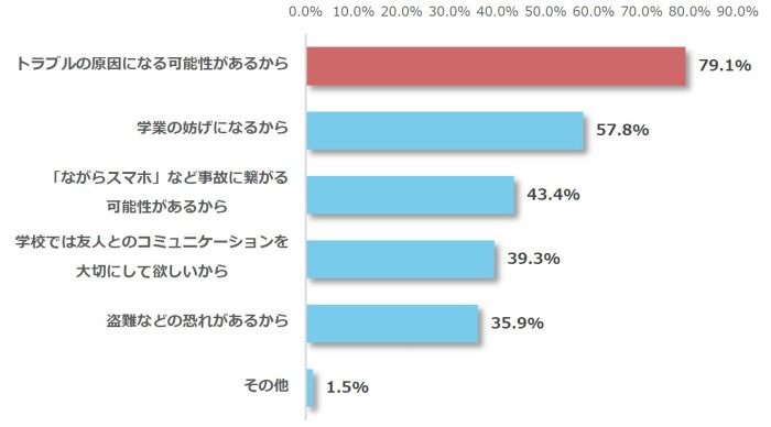 スマホ持込み反対派の理由、最多は「トラブルの原因になる可能性があるから(79.1%)」