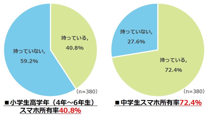 子どもがスマホを所持しているか聞いたところ、小学生高学年では「持っている(40.8%)」、中学生では「持っている(72.4%)」という結果になりました。