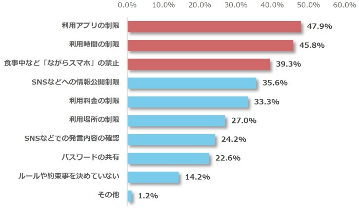 子どもがスマホを所有していると回答した430名を対象に、ご家庭内でスマホに関してどのようなルールや約束事があるかを聞いたところ、最も多かったのが「利用アプリの制限(47.9%)」、次に「利用時間の制限(45.8%)」、「(食事中など)ながらスマホの禁止(39.3%)」と続きました。