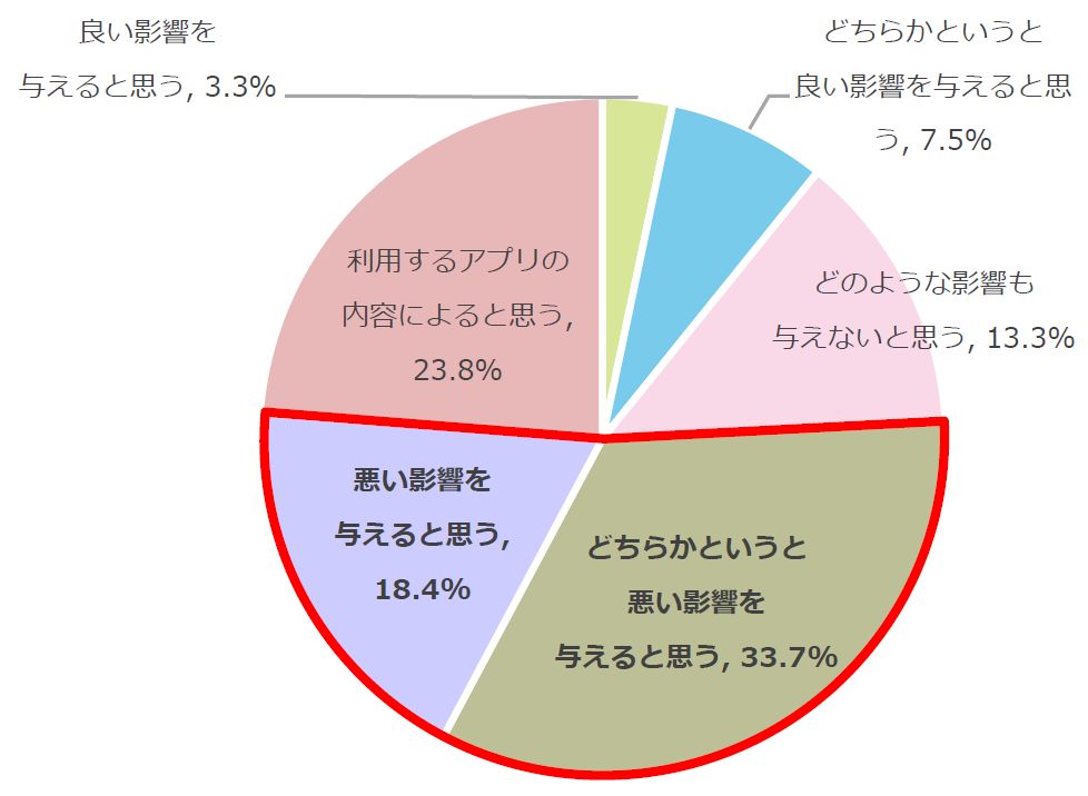 スマホが子どもの学業に対してどのような影響を与えると思うかと聞いたところ、「良い影響を与えると思う(3.3%)」、「どちらかというと良い影響を与えると思う(7.5%)」と合わせて10.8%の保護者が良い影響を与えると考えていることが分かりました。また、「利用するアプリの内容によると思う」と回答した保護者は23.8%で、それ以外の52.1%の保護者に関しては、アプリの内容にかかわらず、悪い影響を与えると危惧していることが分かりました。