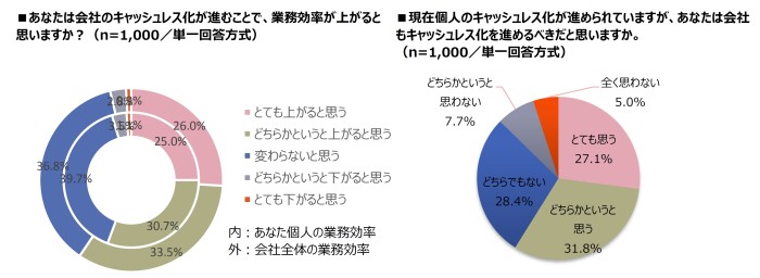 半数以上がキャッシュレス決済は経理担当者の業務効率だけでなく、会社全体の業務効率の改善に繋がると回答。58.9%が会社のキャッシュレス化を進めるべきと回答