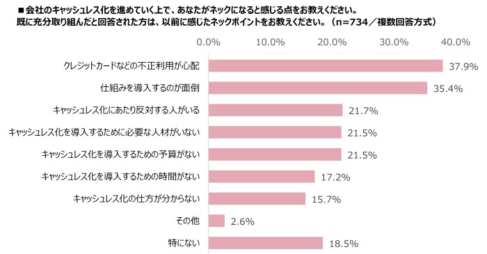会社のキャッシュレス化について「現在取り組んでおらず、今後も取り組む予定はない」と回答した266名を除く734名を対象に、キャッシュレス化を進めるにあたってネックになると感じる点を聞いたところ、最も多かったのが「クレジットカードなどの不正利用が心配(37.9%)」で、次いで「仕組みを導入するのが面倒(35.4%)」が続き、3位には「キャッシュレス化にあたり反対する人がいる(21.7%)」という回答も寄せられました。