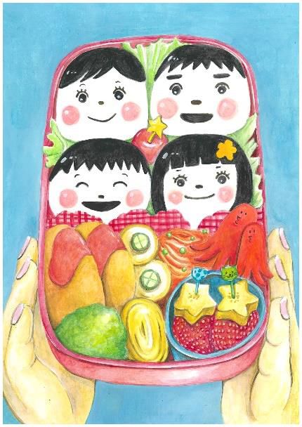 おにぎりで表現されたご家族のかわいらしい笑顔と、あたたかみのある絵の雰囲気が素敵です。