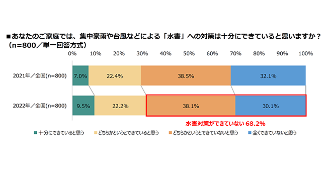 また、水害への対策ができているかを聞いたところ、「十分にできている」と回答した方は9.5%にとどまり、68.2%が水害対策ができていないことが分かりました。
