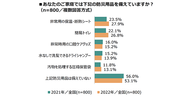 災害時の備えとして、意外に忘れられがちなのがトイレの対策や口腔ケアグッズの備えです。各グッズについてそれぞれ備えの状況を聞くと、「簡易トイレ」を備えていると答えたのは26.8%で、「口腔ケアグッズ」に関しては15.2%と昨年と比較しても、備えが進んでいない実態が分かりました。