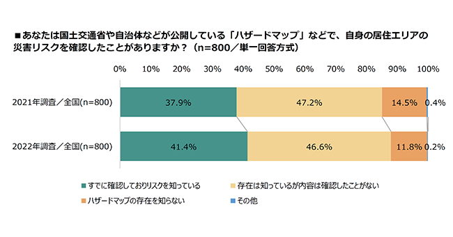 国土交通省や自治体などが公開している、自然災害などによる災害リスクを地図化した「ハザードマップ」などで自身の居住エリアの災害リスクを把握しているか聞いたところ、「すでに確認しておりリスクを知っている」と答えた方は全体の41.4%で、昨年の37.9%から3.5ポイント上昇しました。