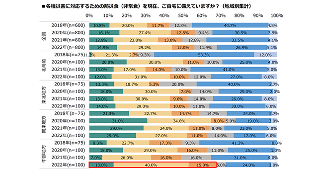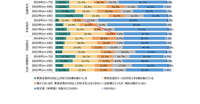 防災食(非常食)の備蓄率を地域別で比較し、少しでも備えていると回答した方を合わせると、中部地方が68.0%と最も高い結果となり、2021年では最多であった関東地方を超える結果となりました。