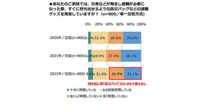 一方で「ほとんど用意していない」と回答した方は26.9%で、「全く用意していない」と回答した32.1%と合わせると59.0%と、未だ半数以上の家庭で防災バッグなどの持ち出し用の防災グッズが用意できていない状況も分かりました。