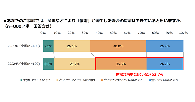 近年では豪雨などによる水害や停電など、地震以外にも様々な災害リスクが懸念されており、備えや対策がより重要となってきています。そこで、停電への対策ができているかを聞いたところ、「十分にできている」と回答した方は8.0%にとどまり、62.7%が停電対策ができていないと回答する結果となりました。