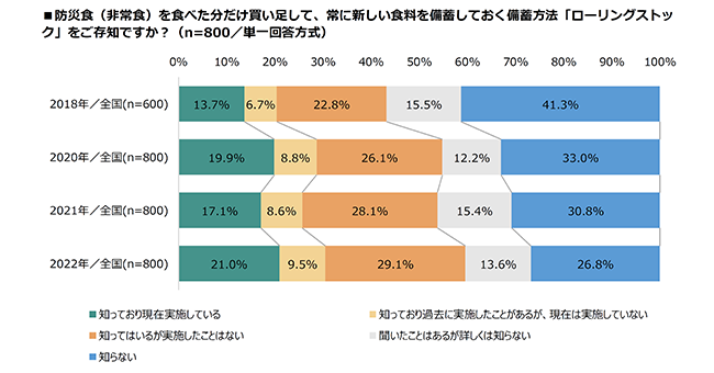 防災食(非常食)を食べた分だけ買い足して、常に新しい食料を備蓄しておく備蓄方法である「ローリングストック」を知っているかを聞いたところ、「知っており現在実施している」と回答した方は21.0%で、2018年の調査開始から最も高い結果となりました。知らないと回答した方も過去最低の26.8%となり、徐々に浸透してきていることが見て取れます。